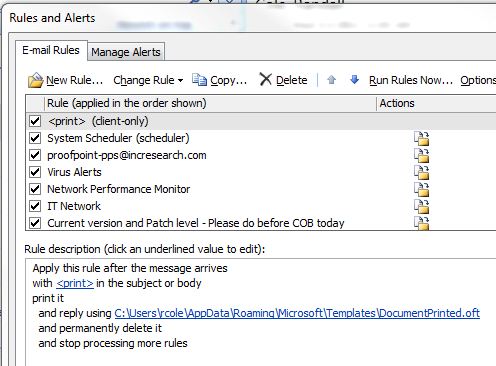 First Outlook needs to be configured with an email account. Then you need to create a rule to do three simple things. The first part of the rule will auto-print anything that has “*print*” in the subject line. This will prevent any spam from auto-printing. The next part of the rule sends a confirmation email. For Outlook to send a confirmation a must be created template first. Making a template is easy; open a new email, type whatever you want and save as an oft file.